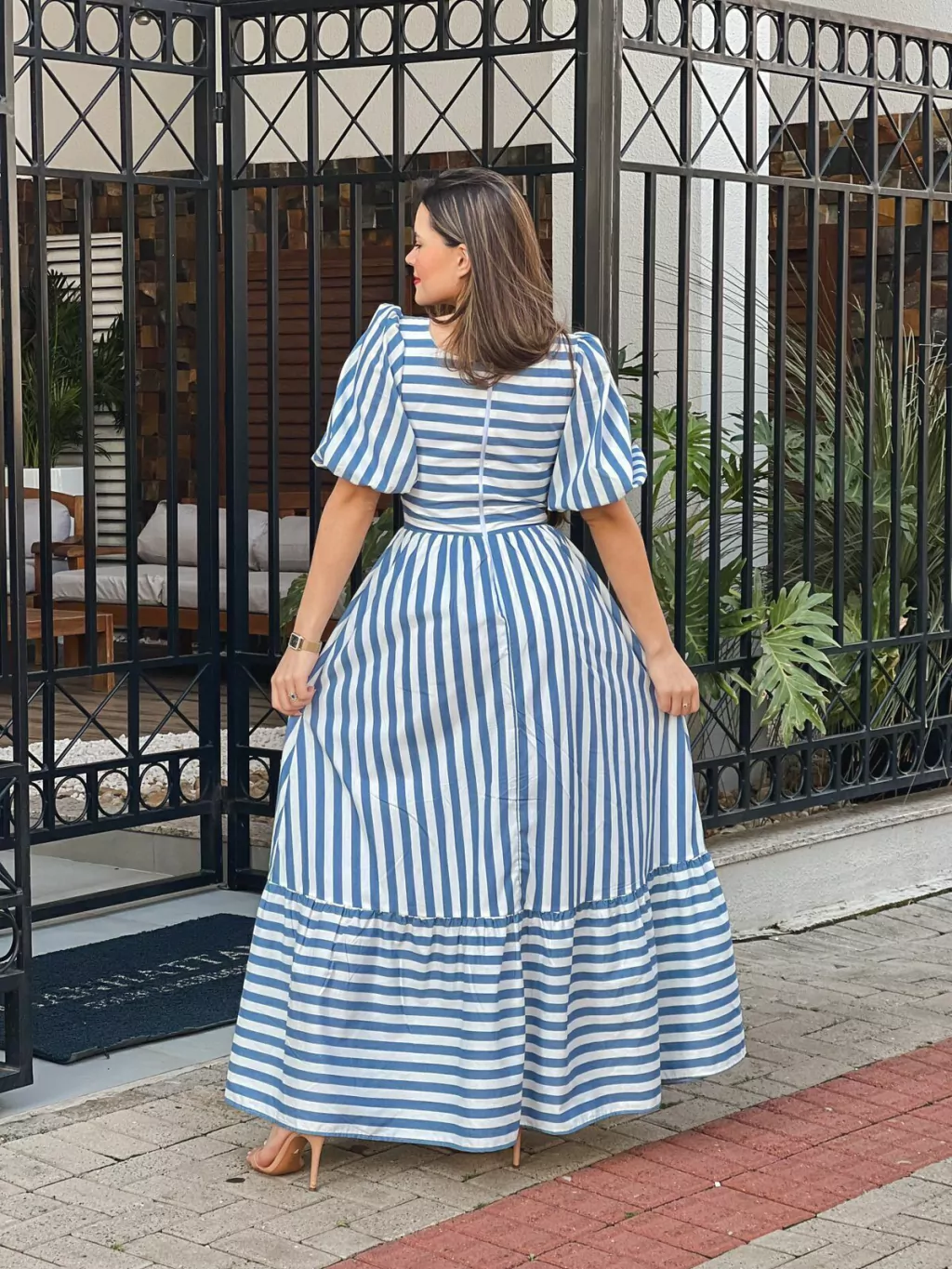 Combine o Vestido Lady Verano com sandálias de salto para um look mais formal ou rasteira para um passeio descontraído. A versatilidade das listras e a fluidez das mangas amplas permitem diversas combinações.
